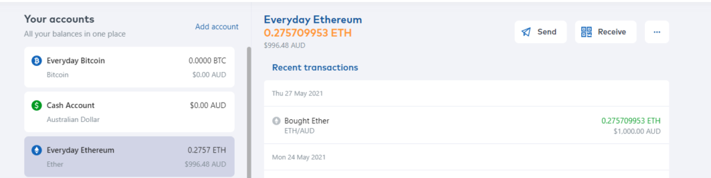 If you go into the Accounts tab and select your Everyday Ethereum account you can see the ETH you have purchased. Now we will move these funds to our Metamask wallet by selecting the Send button.