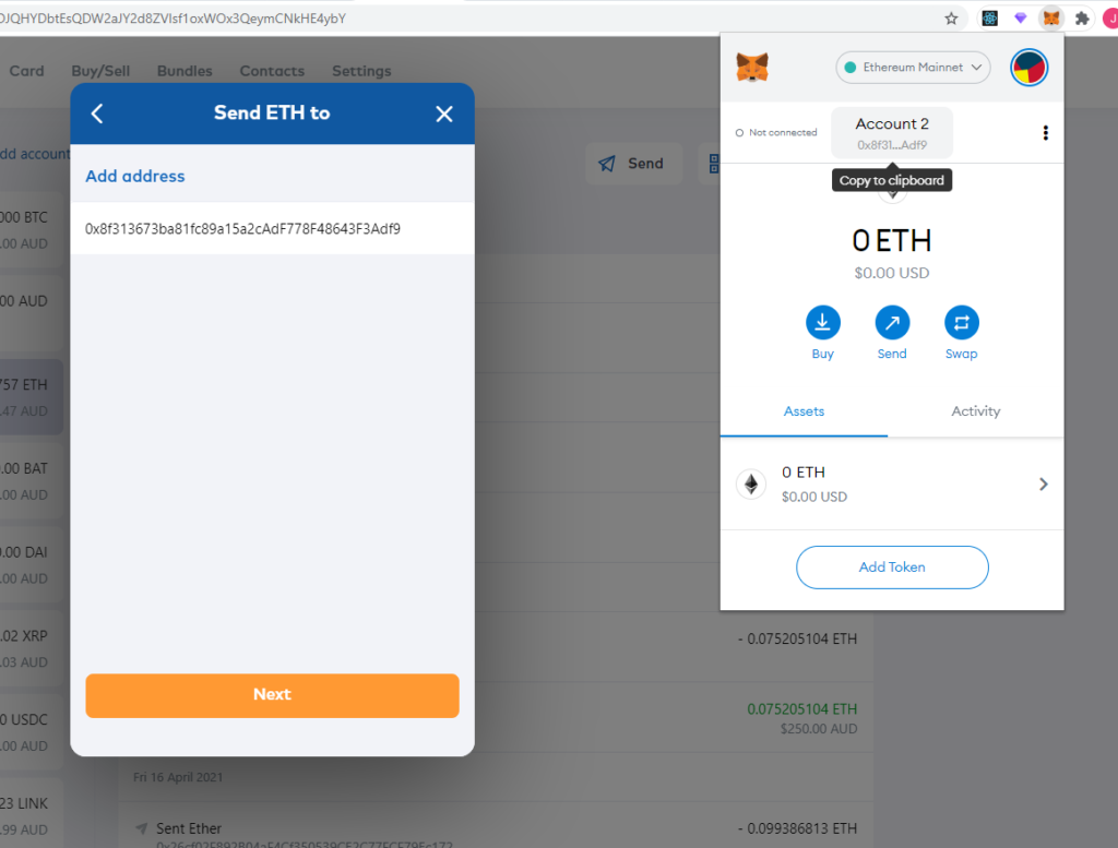Open Metamask and select your Account to copy the account address to the clipboard and then paste it into the address in Coinjar and select next.