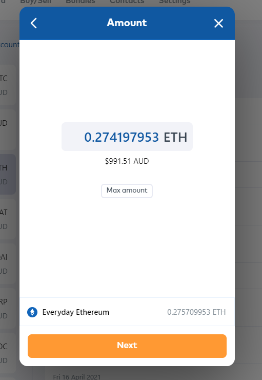 Select the âMax amountâ button to send all of your ETH in Coinjar to your MetaMask wallet address, then select Next.