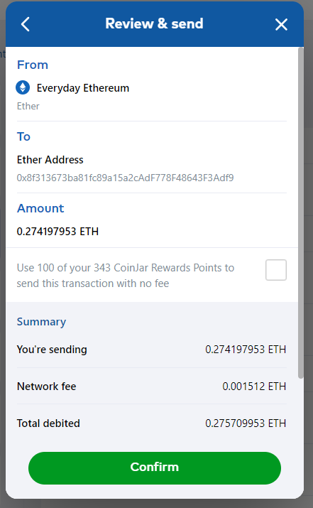 Next, you will see a review screen, you will need to put a transaction fee to move these funds into your Metamask Wallet, if you have sufficient Coinjar Rewards Points you can spend them to avoid this fee. When you are ready select Confirm.