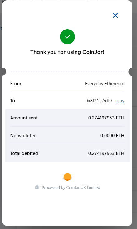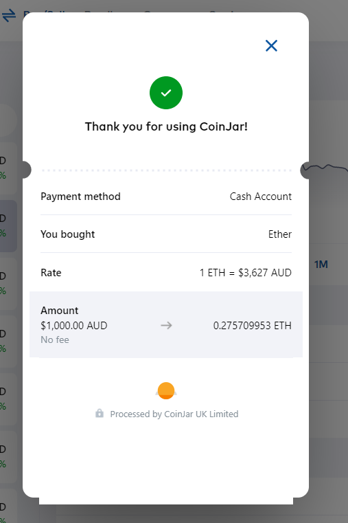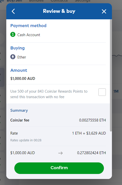 Coinjar will display the amount of ETH you are purchasing for your AUD along with a 1% Coinjar fee which can be avoided by spending Coinjar Rewards Points if you have enough. To proceed select the confirm button.