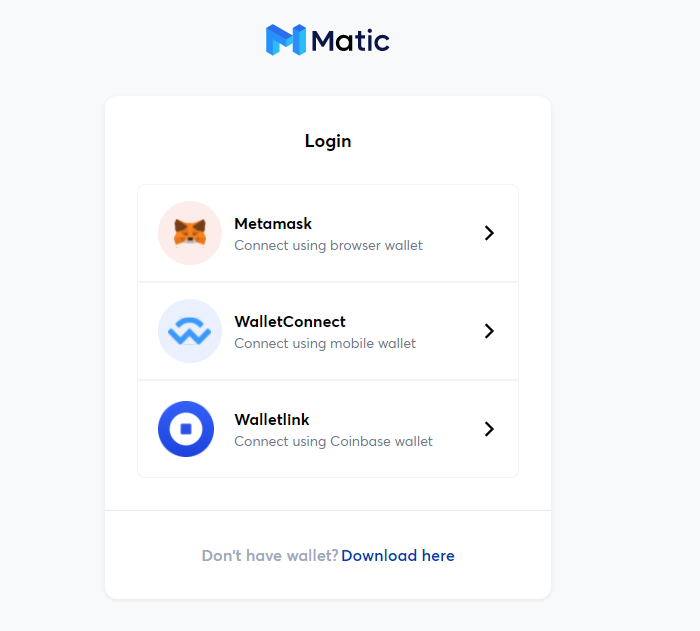In Metamask, select the Ethereum Mainnet network then visit https://wallet.matic.network/ and log in using your Metamask wallet by selecting the âMetamask Connect using browser walletâ button.