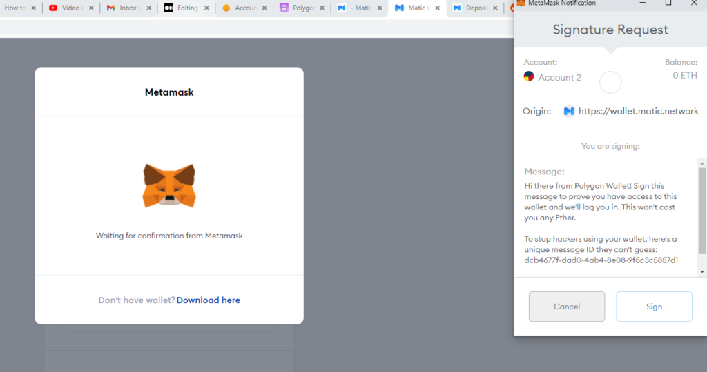 You will see a Signature Request transaction popup in Metamask, select the âSignâ button.