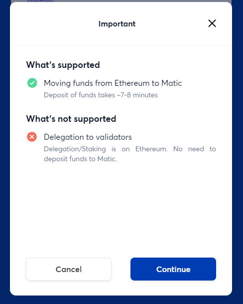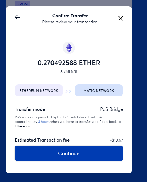 Once the transaction has been confirmed in Ethereum it will take 7â8 minutes for the funds to be set up on the Polygon network. Press Continue to proceed.