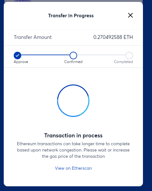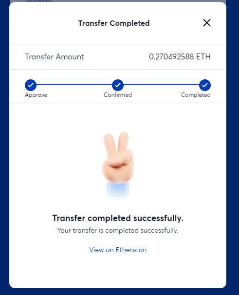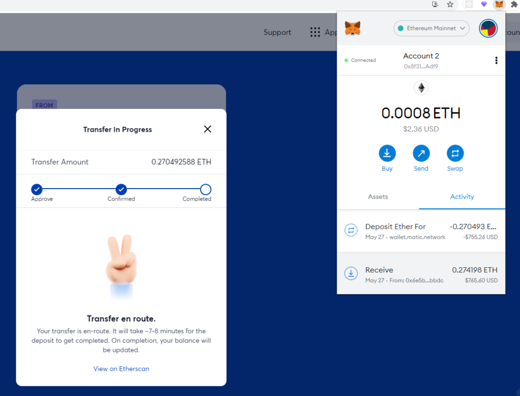Once the funds have been transferred to Polygon, the transfer will be shown as Completed.