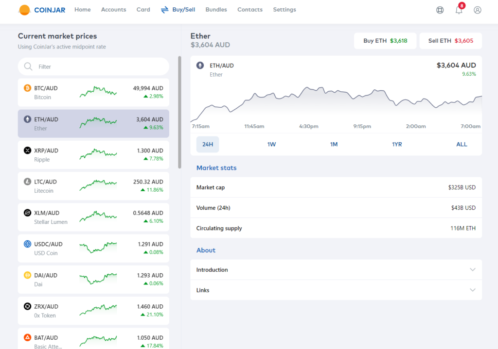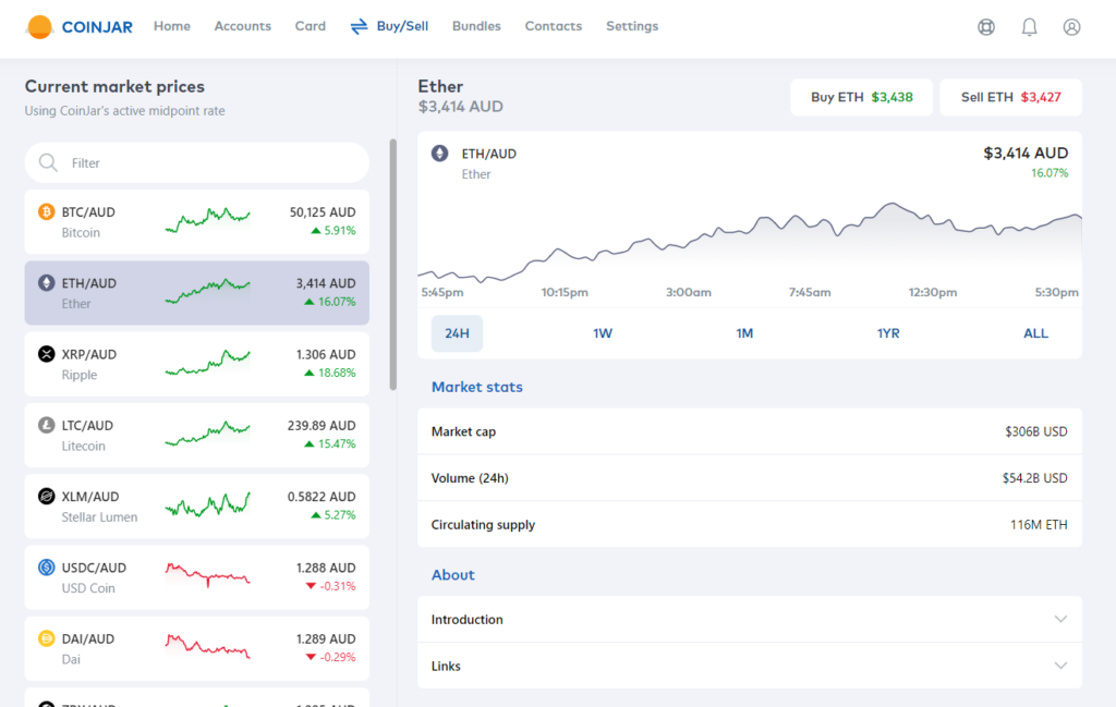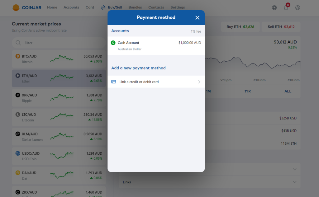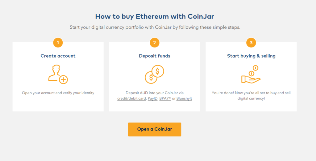 In order to buy Ethereum with Coinjar, you will need to sign up and create a Coinjar account. You will need to verify your identity then you will be able to fund your account with Australian Dollars via credit/debit card, PayID, BPAY, or Bluesyshft.