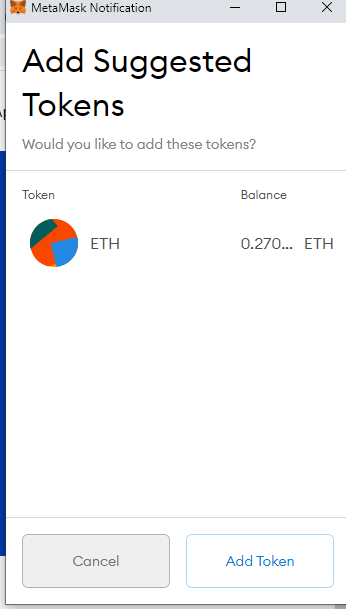 In the Metmask window, you will see a âAdd Suggested Tokensâ window with your ETH balance in Polygon, select the âAdd Tokenâ button.