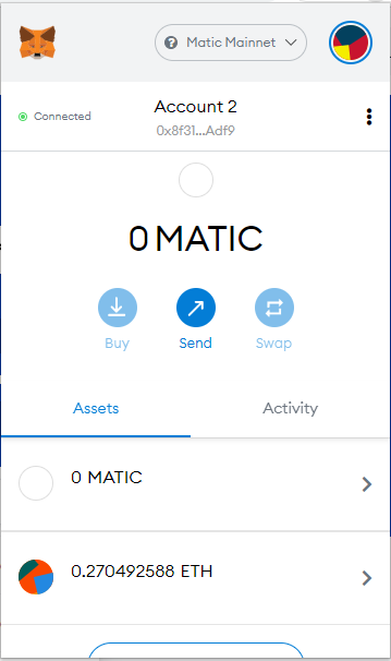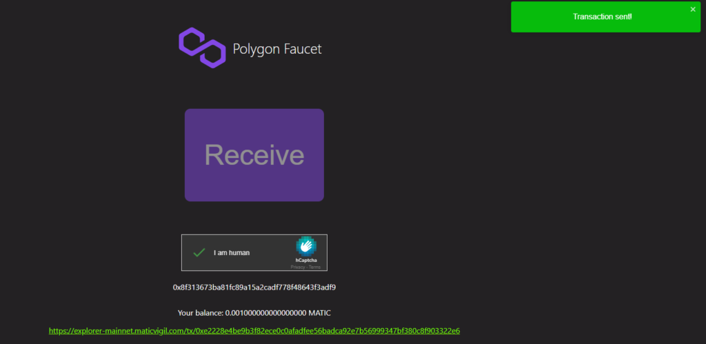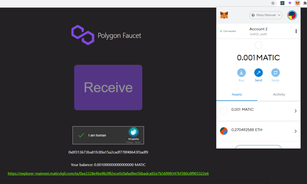 Then if you check your MATIC balance in Metamask you should see 0.001 MATIC in your wallet.