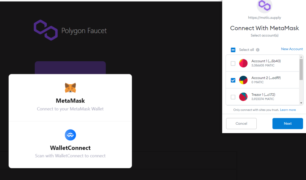 Select the âMetaMask Connect to your MetaMask Walletâ button then in the MetaMask popup, select your account containing the bridged funds and select âNextâ.