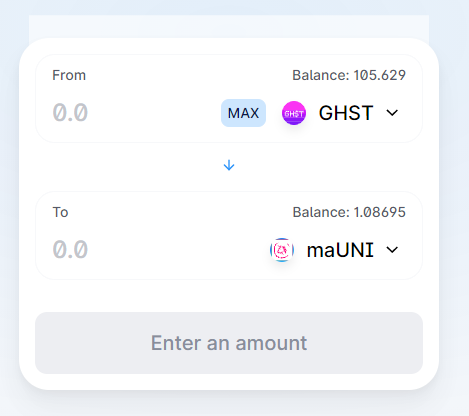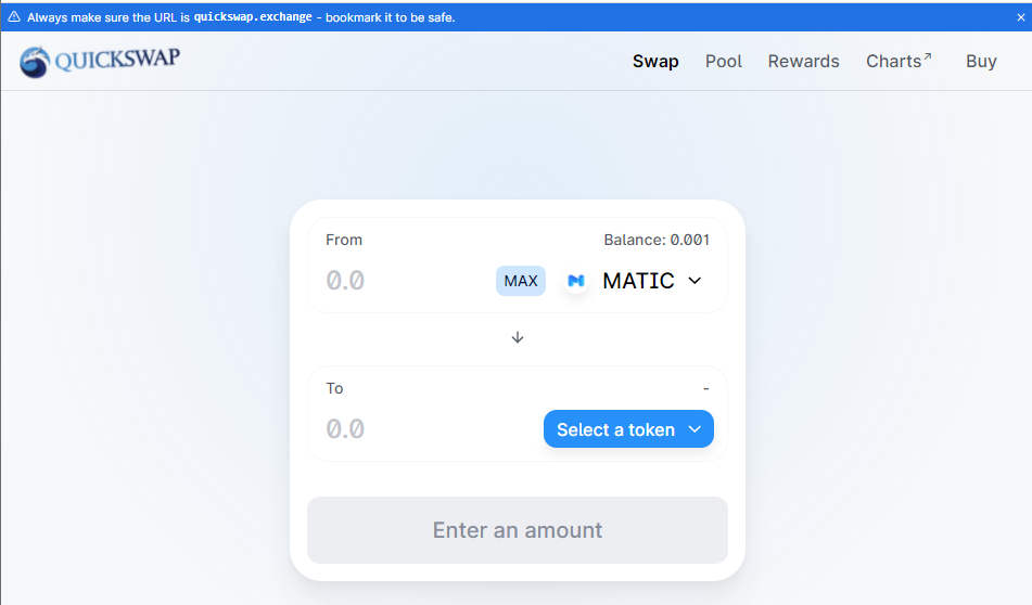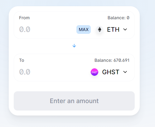 To get GHST tokens we will use the Quickswap decentralised exchange at https://quickswap.exchange/
