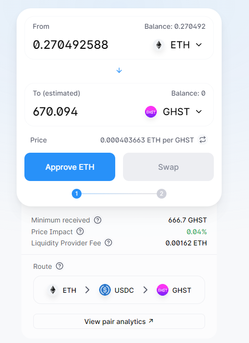 Change MATIC to ETH, then in the second slot select the GHST token. Enter the amount of ETH you want to trade for GHST, then select the âApprove ETHâ button which is required in order to swap the tokens.