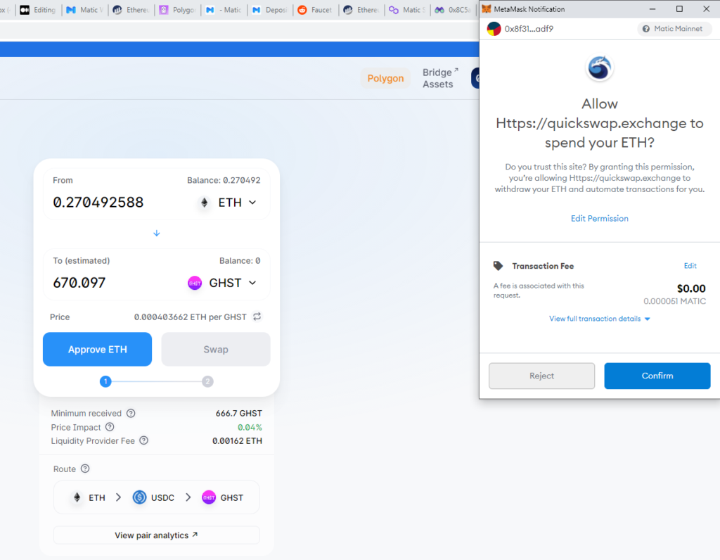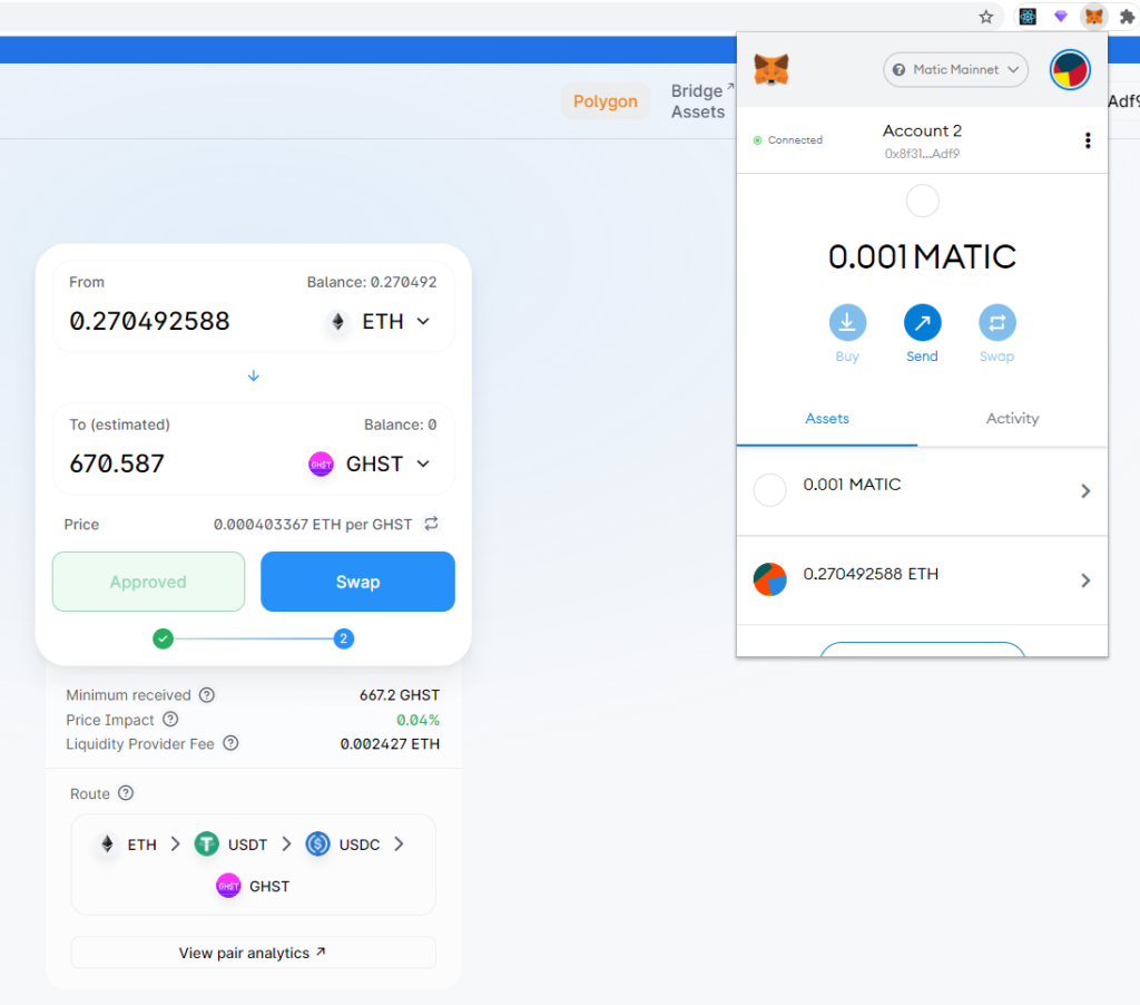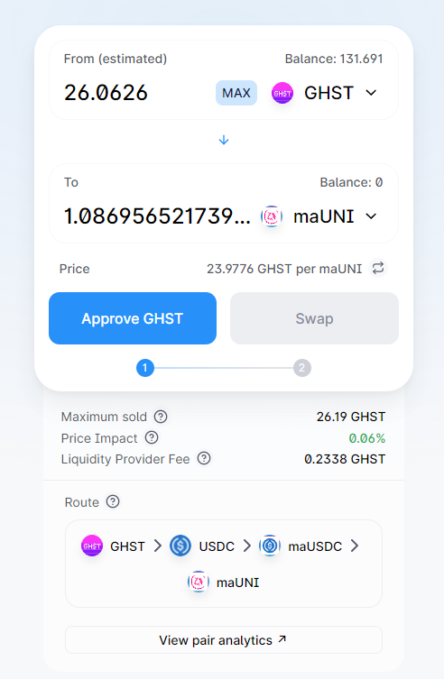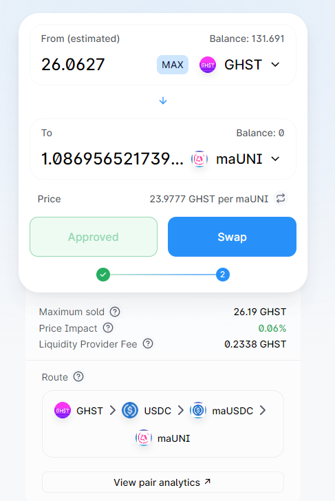 This link will navigate you to Quickswap, where you can trade my GHST tokens for the recent maXXX tokens. Just like before, first we will need to âApprove GHSTâ via a Metamask transaction.