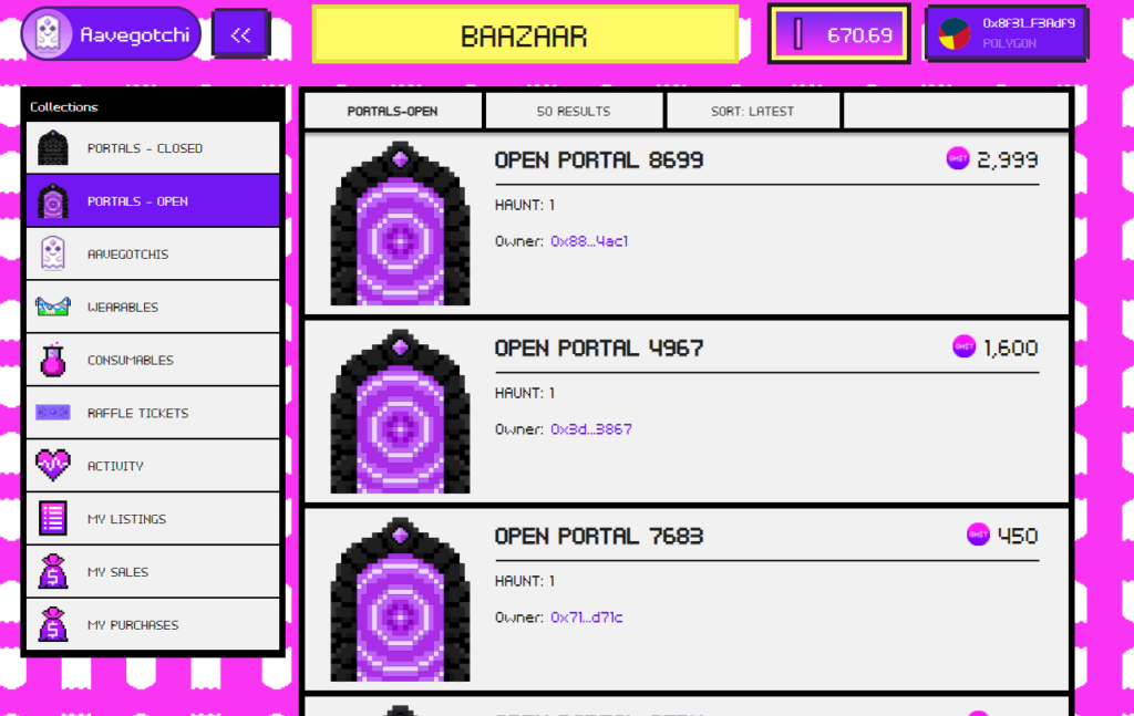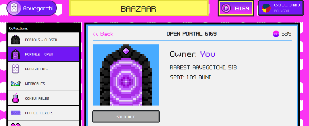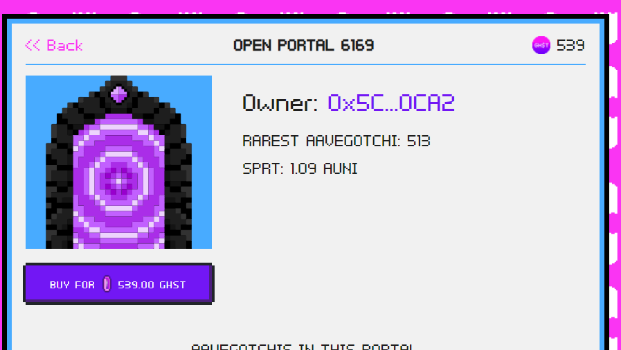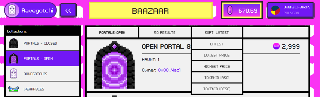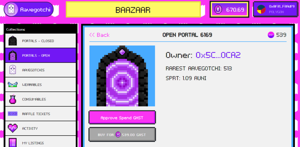 Next, we will purchase an open portal from the Aavegotchi Baazaar, which we will use to summon our first Aavegotchi.