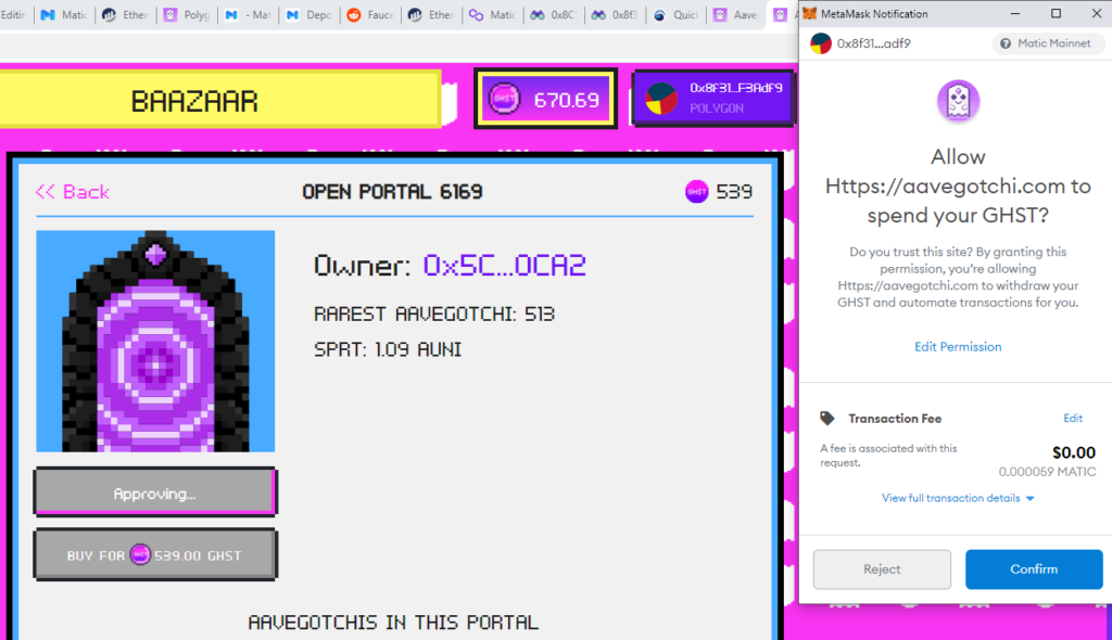 When you are ready to purchase a portal, select the âApprove Spend GHSTâ button against the open portal listing.