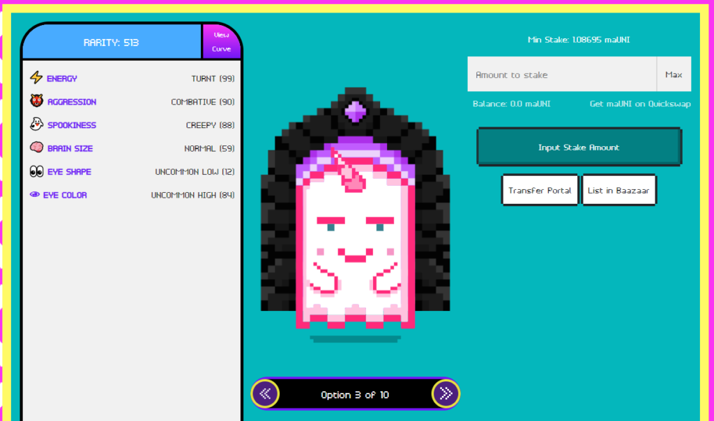 Keep in mind not to spend all of your GHST tokens as you will also need to acquire some staking collateral to add to your Aavegotchi to summon it. This is the mechanism for how your Aavegotchi earns interest. The amount of collateral required is visible against each Aavegotchi inside the open portal on the listing page.
