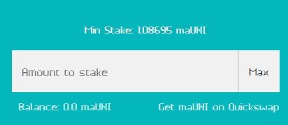 To acquire these tokens, select the âGet maXXX on Quickswapâ text underneath the âAmount to stakeâ field.