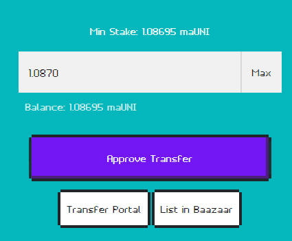 Then select the âMaxâ button to supply the maUNI tokens required, then select the âApprove Transferâ button to make an approval transaction via Metamask.