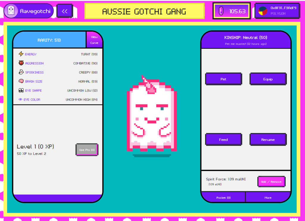 THE FARMING: You can earn money from your Aavegotchi by competing in rarity farming in three different categories rarity, kinship and experience. Rarity can be increased by selecting the best traits for your Aavegotchi and dressing your Aavegotchi with wearables. Kinship is developed by petting your Aavegotchi once every 12 hours and experience is grown by voting on governance proposals and playing minigames.